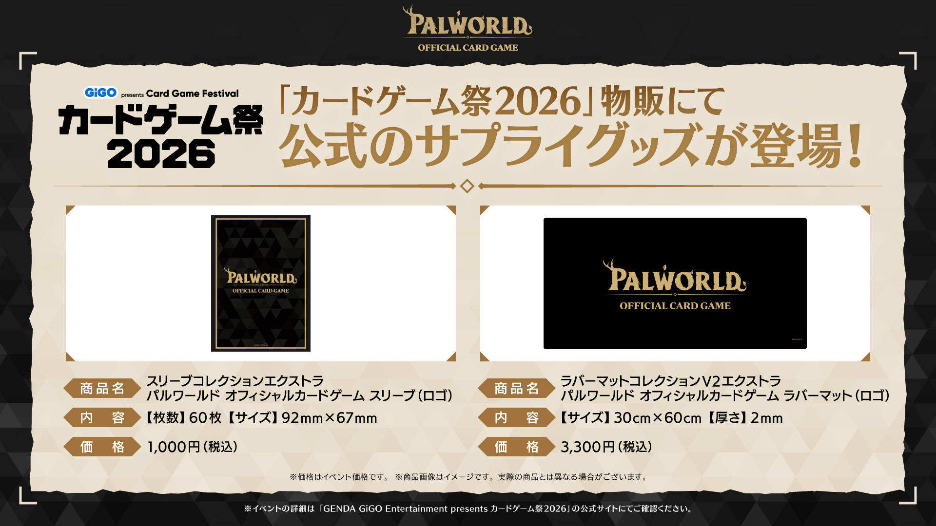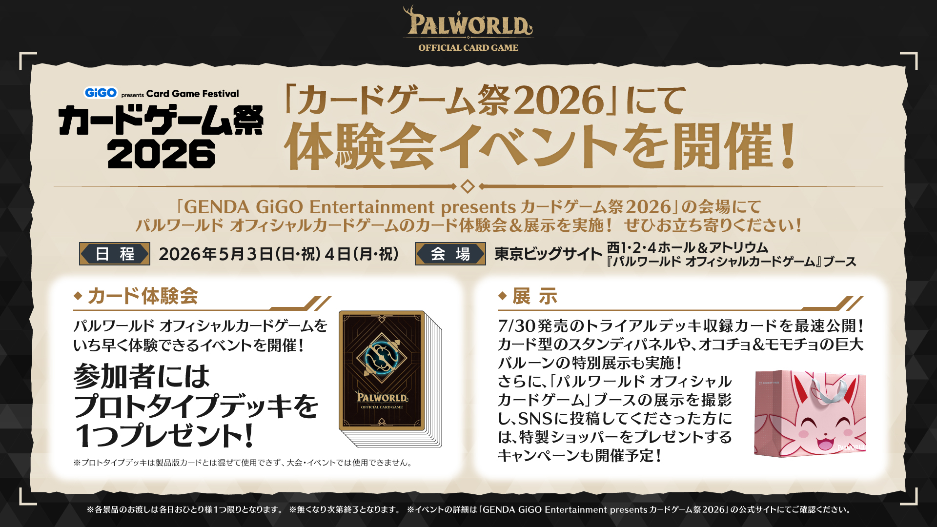 2026年5月3日(日・祝)、4日(月・祝)開催「GENDA GiGO Entertainment presents カードゲーム祭2026」会場にて、『パルワールド オフィシャルカードゲーム』のカード体験会や展示を実施!