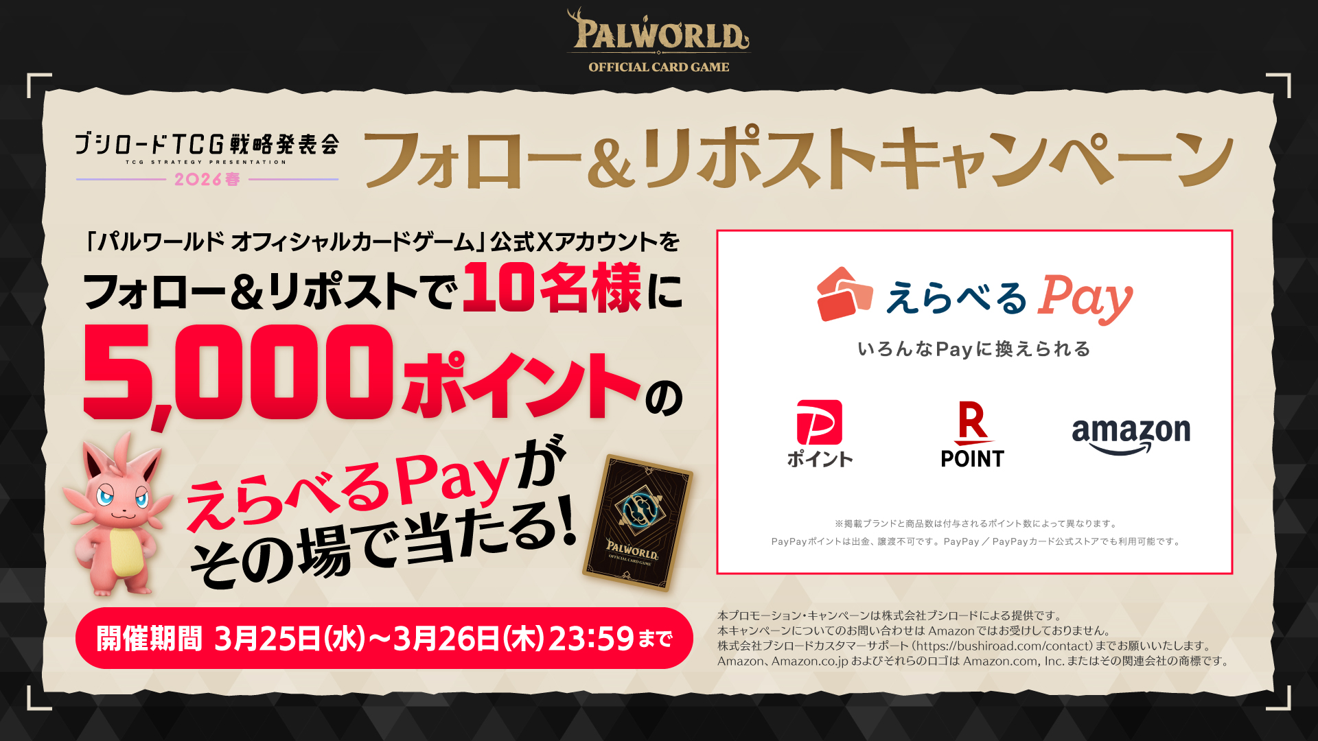 「ブシロード戦略発表会2026 春」での発表を記念して『パルワールド オフィシャルカードゲーム』公式Xにてフォロー&リポストキャンペーンを実施中!